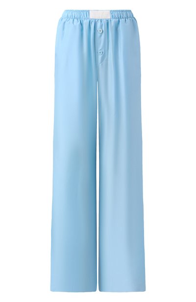 Широкие брюки в пижамном стиле сшили из блестящего шелкового атласа. Модель с гульфиком на пуговицах, боковыми и прорезным задним карманами украсили нашивкой с числовым кодом на эластичном поясе и фирменной белой строчкой сзади.