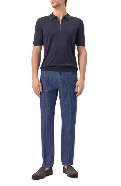 Джинсы со стрелками выполнили из денима на основе хлопка и льна. Модель дополнили пятью карманами, а две шлевки украсили фирменными заклепками-октагонами, пояс – брендированным патчем.