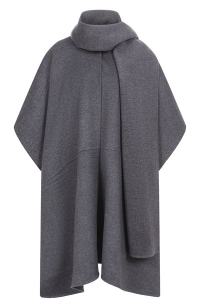 Кейп с двумя карманами и асимметричным низом сшили из фирменной двухслойной ткани на основе шерсти, сертифицированной RWS. Модель с пуговицами спереди и по бокам дополнили широким съемным шарфом.
