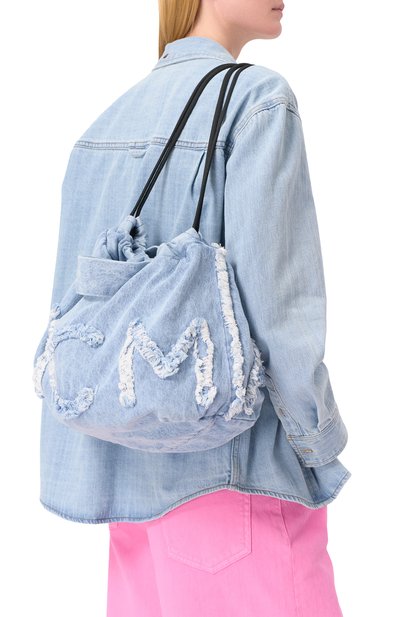 Шопер с двумя длинными ручками сшит из прочного денима. Сумка, в которую поместятся бумаги формата А4, украшена спереди вышитым логотипом бренда и слоганом «Have a nice day! Please recycle».