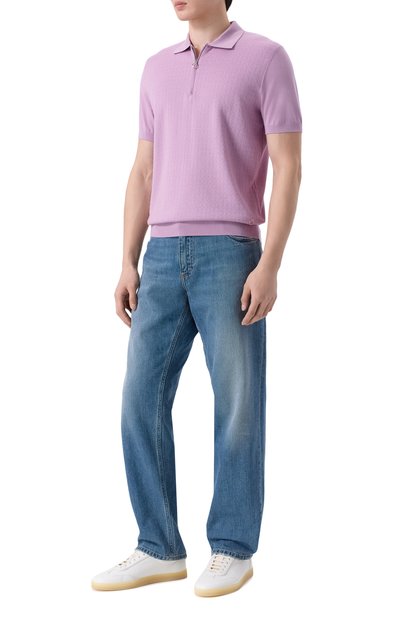 Поло с объемным жаккардовым узором спереди выполнили из кашемирового трикотажа. Модель застегивается короткой молнией с пуллером в форме фирменного октагона.