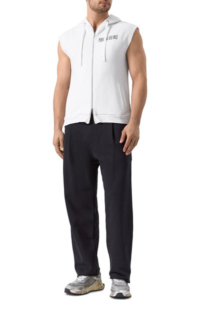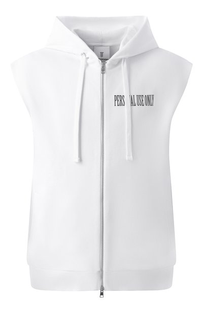 Толстовку с регулируемым капюшоном и двумя боковыми карманами сшили из хлопкового трикотажа. На груди напечатали надпись Personal use only. Проймы модели без рукавов оставили необработанными.