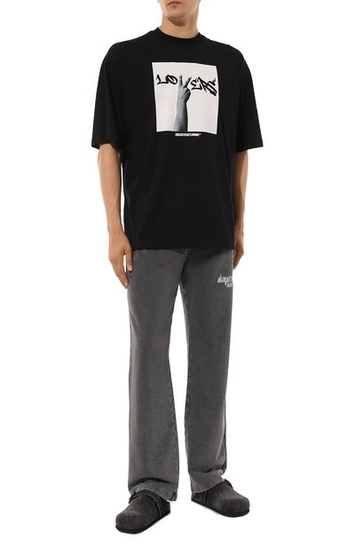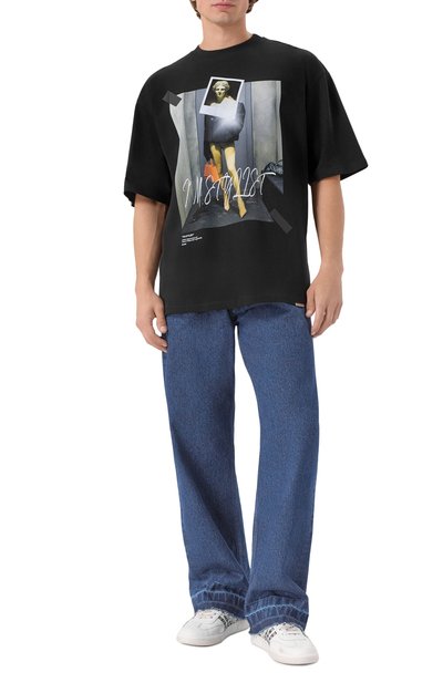 Футболку со спущенной линией плеч выполнили из хлопкового джерси. Спереди модель украсили коллажным принтом, в который вписали снимок Джастина Бибера, сделанный на церемонии «Грэмми». Сзади расположили текстовый мотив.