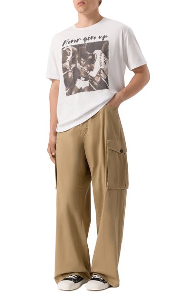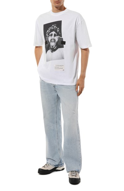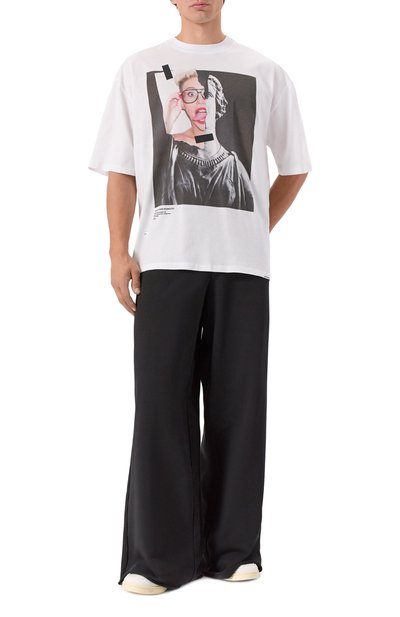 Футболка прямого кроя выполнена из гладкого хлопкового джерси. Модель с круглой горловиной украшена спереди коллажным принтом из портретов Мерилина Мэнсона и Мерлин Монро, а сзади — информационным патчем.