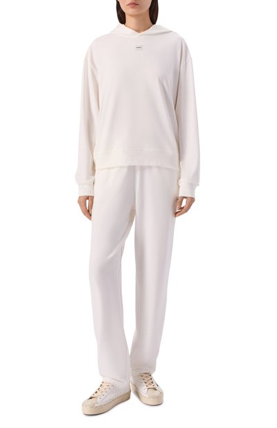 Широкие брюки высокой посадки сшили из хлопкового флиса с добавлением полиэстера. Модель с двумя врезными карманами и эластичным поясом украсили сбоку контрастным логотипом бренда.