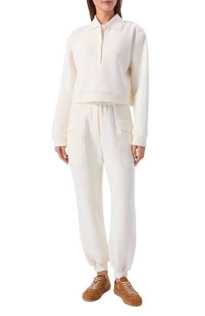 Джоггеры из плотного хлопкового трикотажа станут основой комфортного городского аутфита. Модель с эластичными манжетами и поясом-кулиской дополнили боковыми карманами и задним с фирменным патчем.