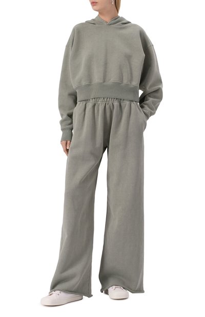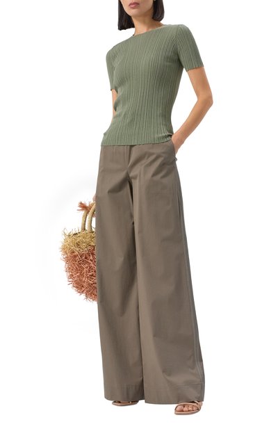 Брюки с высокой посадкой сшиты из хлопкового канваса оттенка mint. Под поясом со шлевками заложили парные защипы. По бокам предусмотрели два кармана, а сзади – еще один.