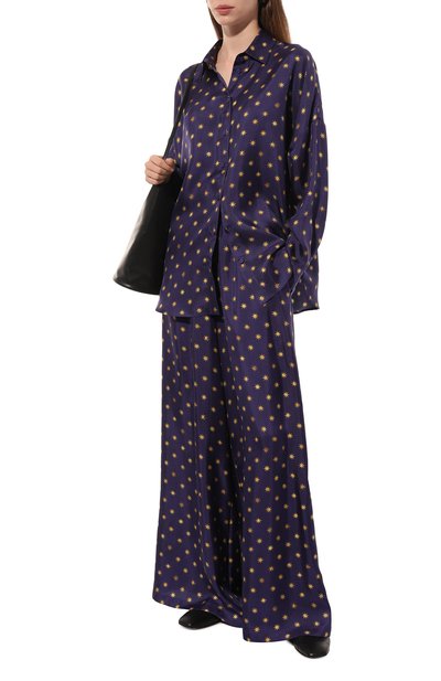 Блузу в крупный контрастный горох сшили из полупрозрачного шелкового шифона. Модель дополнили широкими расклешенными манжетами с пуговицами.