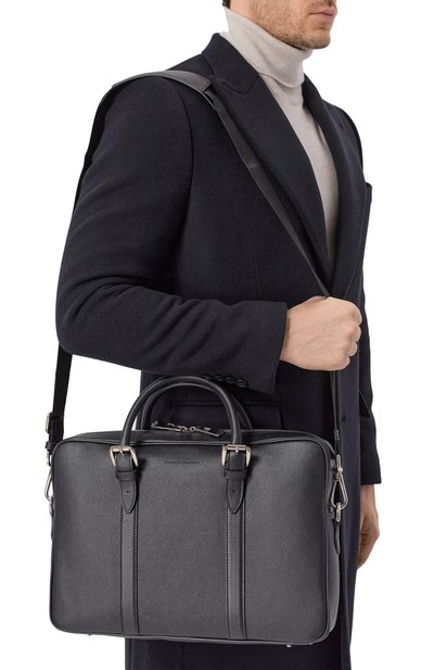Портфель с парой коротких ручек сшили из телячьей кожи. Модель с отделкой из прорезиненного текстиля дополнили внутренними и внешним карманами. В комплекте — регулируемый плечевой ремень.