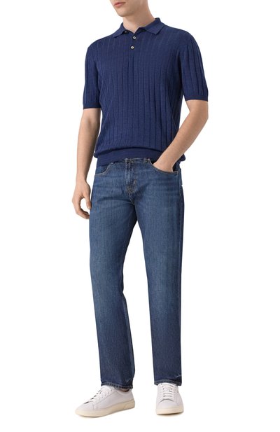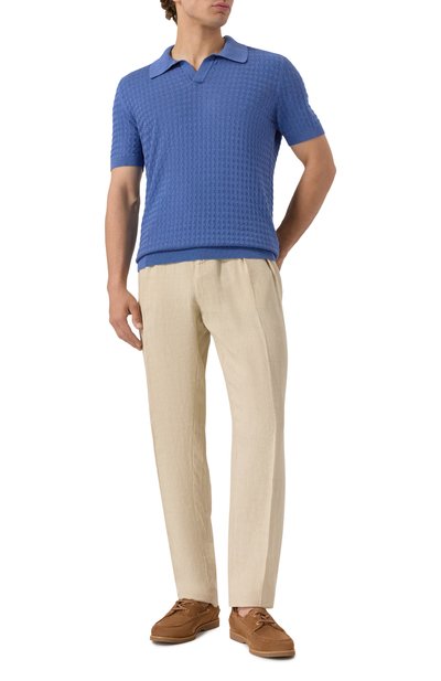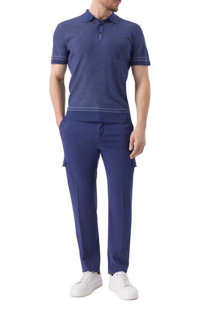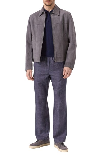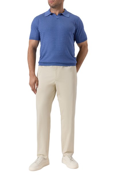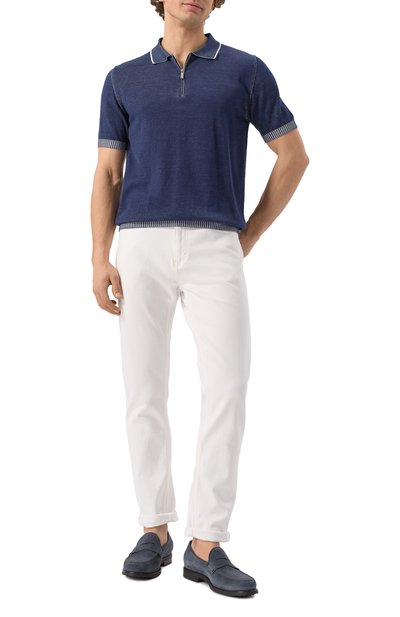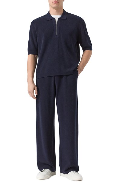 Для изготовления модели с ребристыми манжетами и поясом использовали смесовый трикотаж из хлопка, кашемира и шелка. Поло с короткими рукавами и застежкой на молнию удачно дополнит базовый гардероб.