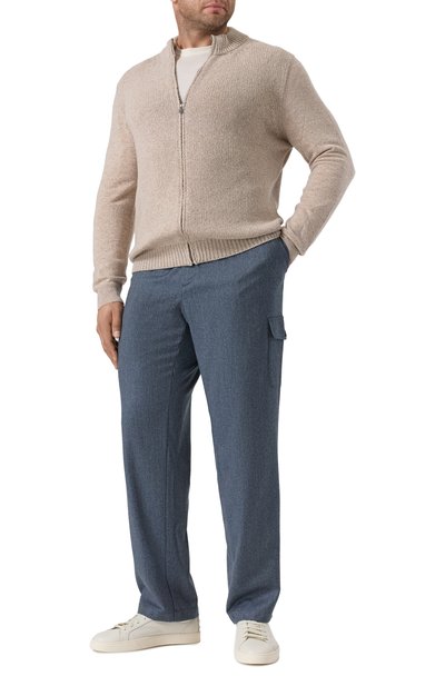 Брюки с широким эластичным поясом и манжетами в рубчик связали из хлопковой пряжи с добавлением шелка и кашемира. Модель, дополненная боковыми карманами, составит комфортный повседневный образ с парным поло.