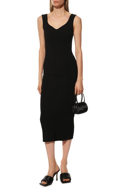 Миди-юбку, облегающую бедра, выполнили из пряжи на основе шелка и льна. Модель украсили ажурным геометричным орнаментом, выполненным в технике кроше. Образ total black поддержит.