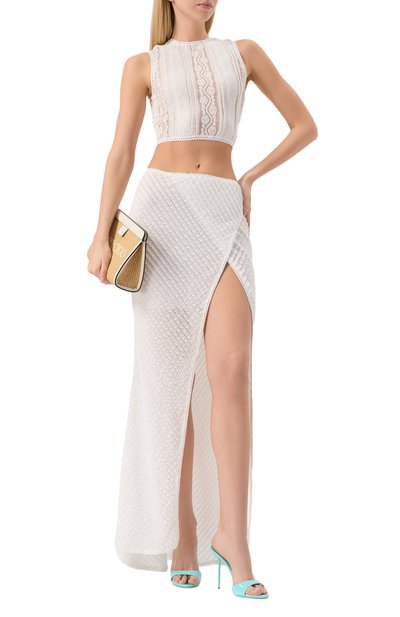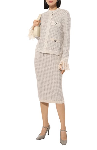 Облегающая миди-юбка с широким поясом выполнена из фактурного трикотажа с люрексом. Два накладных кармана с контрастной окантовкой украшены цветочными аппликациями из пайеток, бисера и кристаллов.