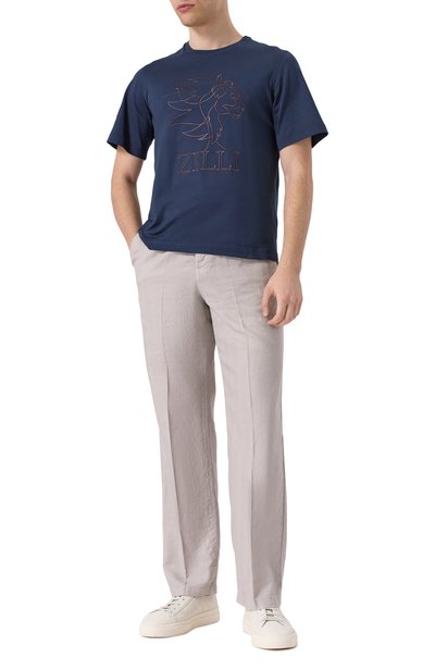 Брюки из тонкого хлопкового трикотажа станут основой непринужденного повседневного комплекта. Модель с ширинкой дополнили поясом-кулиской, который регулируется шнуром с эглетами фирменного алого оттенка. По бокам предусмотрели карманы.