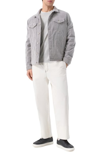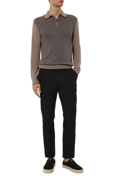 Замшевый верх низких кедов установили на прошитую полимерную подошву. Для внутренней отделки использовали кожу. На язычке и заднике расположили логотип марки.