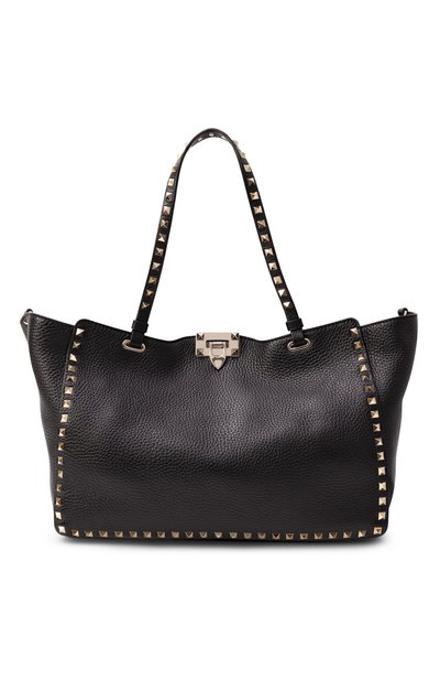 Сумку Rockstud с двумя ручками, украшенная фирменными шипами-пирамидами, выполнили из зернистой телячьей кожи. Внутреннее отделение, закрывающееся замком-крючком, дополнили карманом на молнии. В комплекте – съемный плечевой ремень.