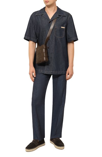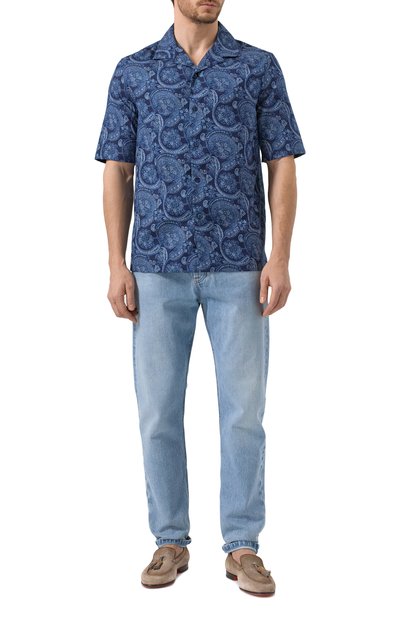 Джинсовую рубашку с фигурными кокетками и английским воротником дополнили нагрудным карманом с клиновидным стичингом. Модель с потертостями сшили из денима с брендированным паттерном.