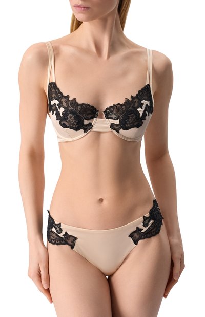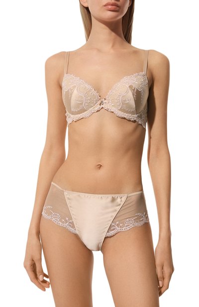 В коллекцию La Dolce Vita вошли трусы из шелкового атласа с добавлением эластановых нитей. Модель с высокой посадкой декорировали инкрустацией из контрастного кружева Leavers с цветочным узором.