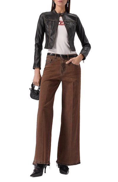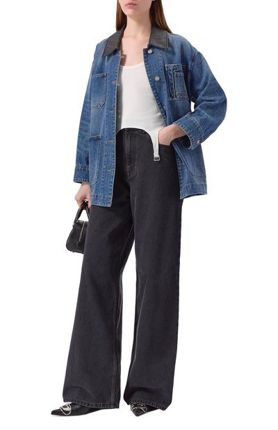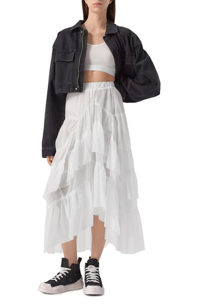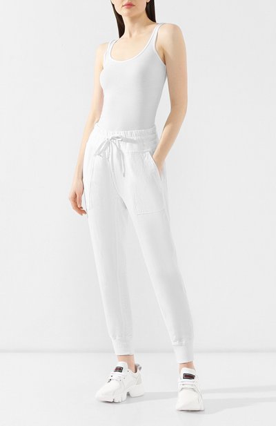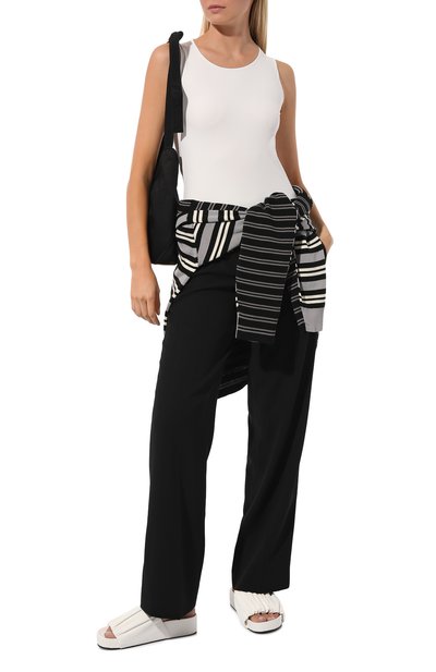 Для пошива облегающей майки с круглым вырезом и глубокими проймами использовали мягкий полупрозрачный микромодал в рубчик. Модель украсили сзади контрастным патчем с логотипом марки.