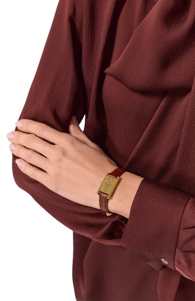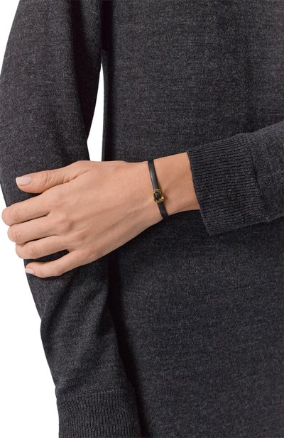 Узкий браслет можно носить, дважды обернув вокруг запястья, или как чокер. Модель из гладкой кожи застегивается брендированной квадратной пряжкой из полированной латуни с гальваническим покрытием 14-каратным золотом.