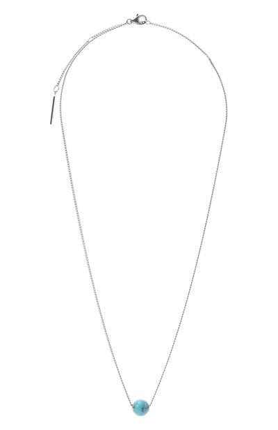 Подвеску в виде круглой бусины выполнили из синтетической бирюзы. Аксессуар дополнили тонкой цепочкой из родированного серебра 925-й пробы, застегивающейся карабином.