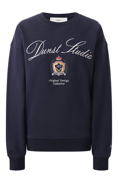 Свитшот с рифленой отделкой сшили из плотного хлопкового трикотажа. Модель украсили спереди вышитыми геральдическим мотивом и логотипом, который повторили на спинке.