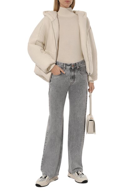 Короткий пуховик силуэта oversize сшили из нейлона. Модель с боковыми карманами и глубоким капюшоном застегивается молнией.