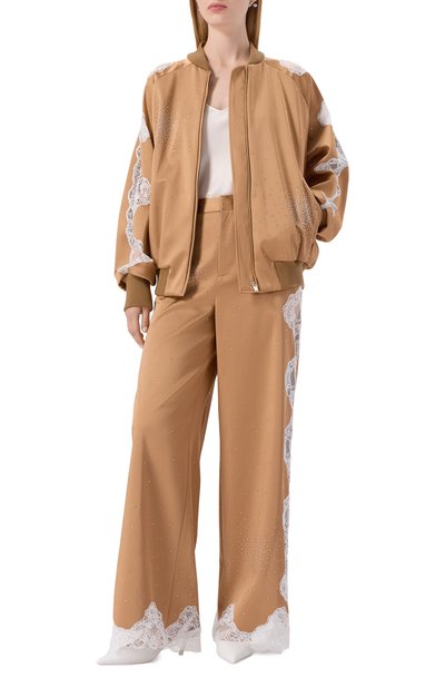 Oversize-бомбер со спущенной линией плеч сшили из плотной шерсти. Куртка с воротником-стойкой, эластичным поясом и двумя карманами застегивается потайной молнией.