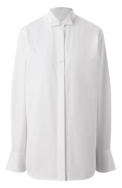 Рубашку с воротником «бабочка» сшили из поплина на основе органического хлопка. На спинке предусмотрели бантовую складку, а по бокам – закругленные разрезы. Модель с увеличенными манжетами застегивается потайными пуговицами, две из которых остались на виду.