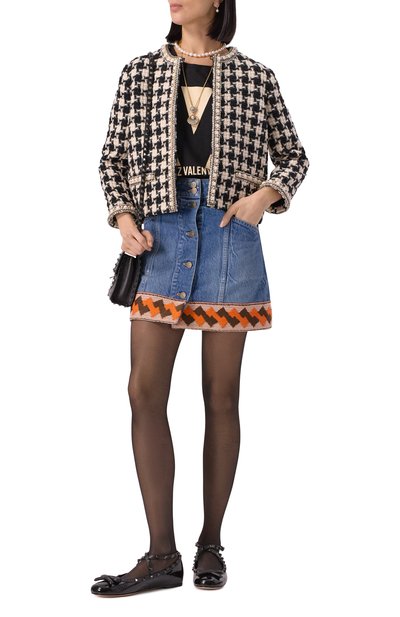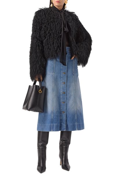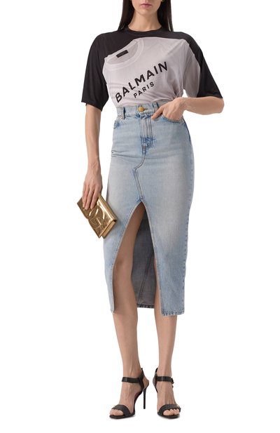 Джинсовая макси-юбка с тремя карманами сшита из хлопкового денима с потертостями. Модель, застегивающаяся спереди металлическими пуговицами, дополнена широким поясом из трикотажа.
