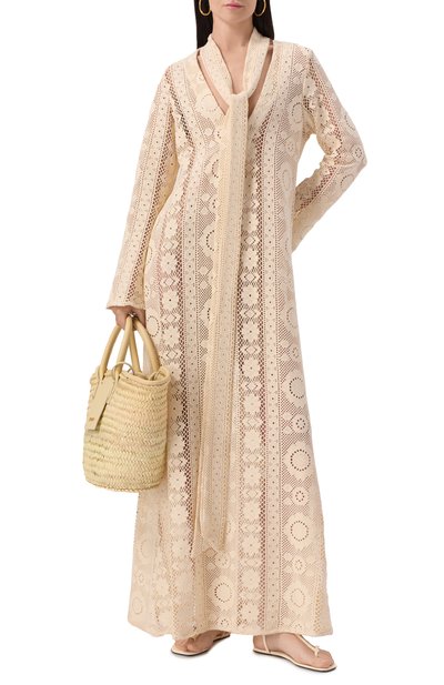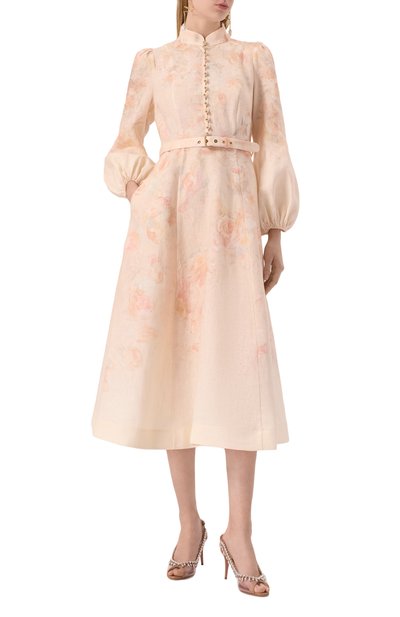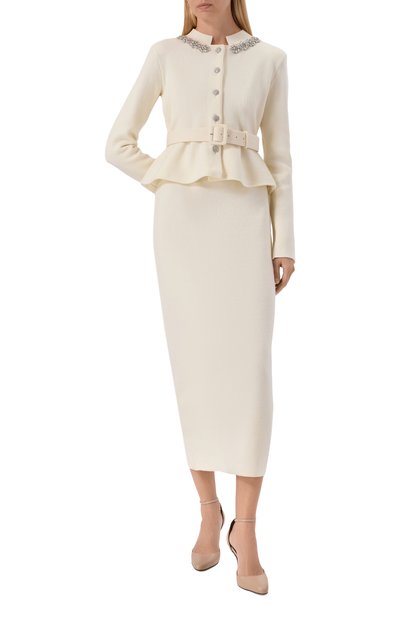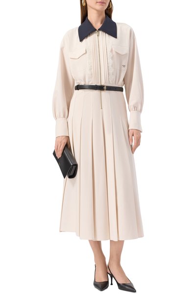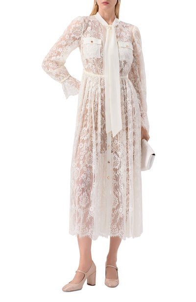 Миди-платье создает видимость комплекта из плиссированной юбки и однобортного жакета с двумя парами накладных карманов. Лиф модели со сверкающими пуговицами выполнили из букле с вышивкой пайетками, а подол с кружевным низом – из легкого шифона. На талии предусмотрели потайную молнию.