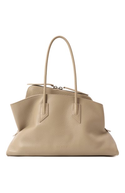 Сумку La Passeggiata с тремя отделениями, центральное из которых застегивается молнией, сшили из крупнозернистой кожи теленка. Модель с двумя длинными ручками украсили тисненым логотипом, а металлическим пуклям на дне придали форму эмблемы. У изделия предусмотрели плоский внутренний карман.