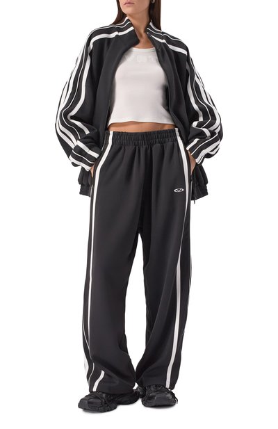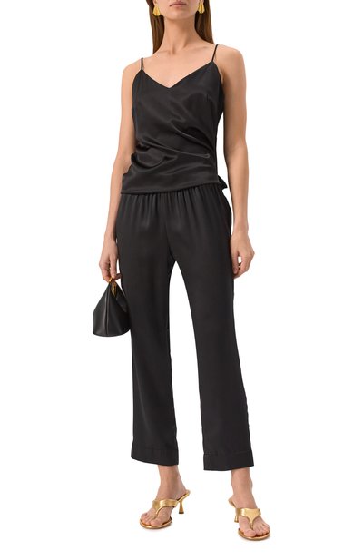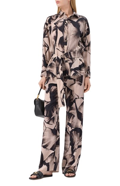 Широкие брюки с принтом в виде ночного пейзажа и логотипом снизу сшили из шелкового твила. Модель с боковыми и прорезными задними карманами и ширинкой с пуговицей дополнили на поясе кулиской с брен дированными эглетами на шнуре.