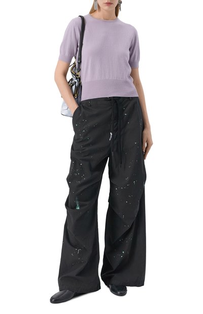 Широкие брюки с принтом в виде ночного пейзажа и логотипом снизу сшили из шелкового твила. Модель с боковыми и прорезными задними карманами и ширинкой с пуговицей дополнили на поясе кулиской с брендированными эглетами на шнуре.