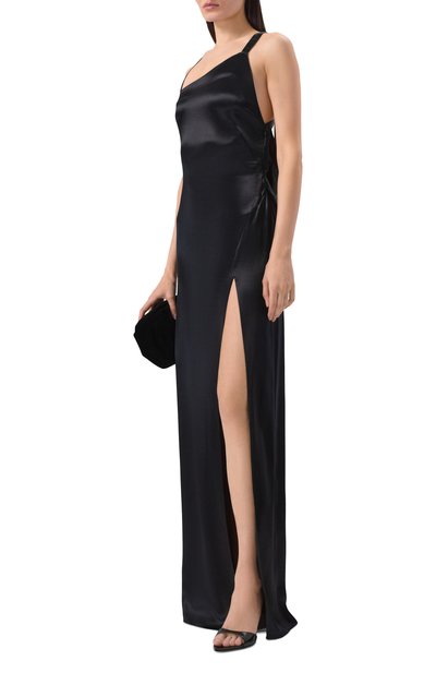Макси-платье с узкими регулируемыми бретелями сшито из вискозного атласа. Приталенная модель с высоким разрезом и драпировками застегивается потайной молнией сбоку.