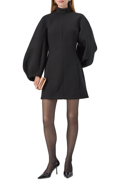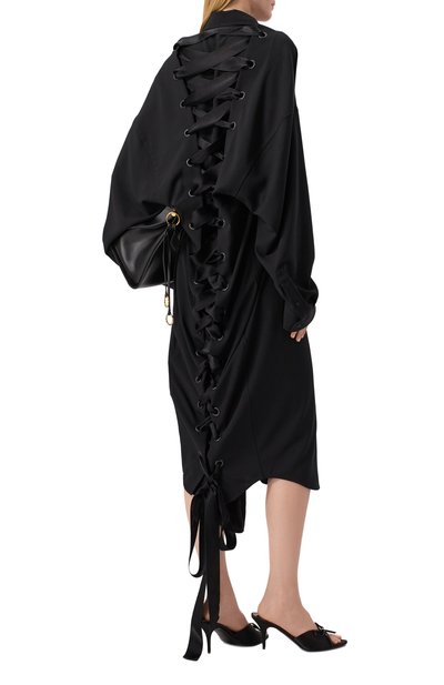 Платье-рубашку со спущенной линией плеч и вытачками спереди, создающими приталенный силуэт и драпировку на лифе, сшили из тонкой кожи ягненка Ovis Aries. Нагрудный накладной карман модели с кнопками по всей длине украсили тисненым логотипом.
