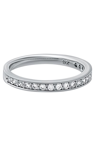 Узкое кольцо Matrix выполнили из полированной латуни с гальваническим родиевым покрытием. Внешнюю сторону аксессуара украсили дорожкой из сверкающих прозрачных циркониев.