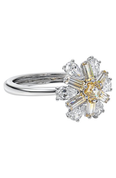 Кольцо Idyllia изготовили из латуни с родиевым покрытием. Аксессуар украсили накладкой в форме цветка, инкрустированной белыми и желтыми циркониями разной огранки так, чтобы сформировать градиент.
