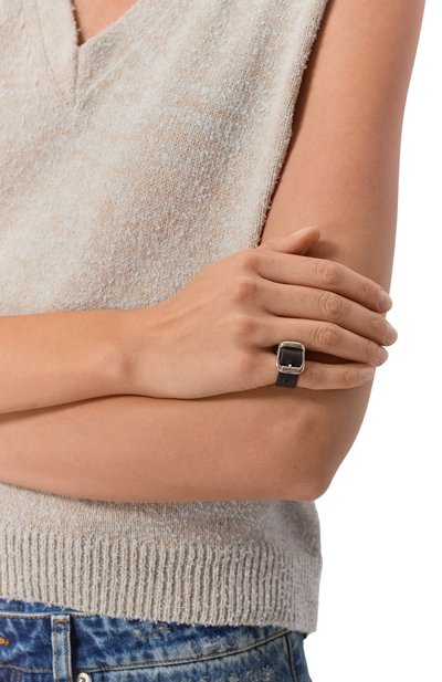 Широкое несомкнутое кольцо Sublima выполнили из латуни с рутениевым покрытием. Объемные центральные элементы украсили кристаллами разных оттенков.