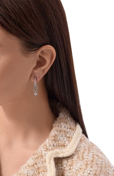 Серьги-пусеты Imber выполнили из латуни с гальваническим покрытием родием. Миниатюрную модель украсили полупрозрачным кристаллом.