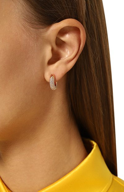 Серьги Hyperbola собрали из трех несомкнутых колец разного размера, два из которых украсили кристаллами. Для изготовления модели с застежкой-пусетой использовали латунь с гальваническим покрытием золотом.