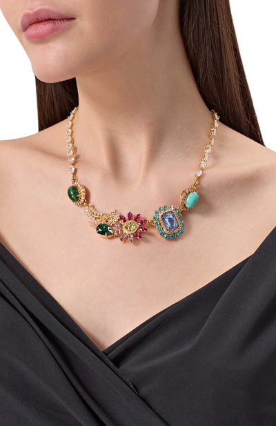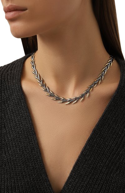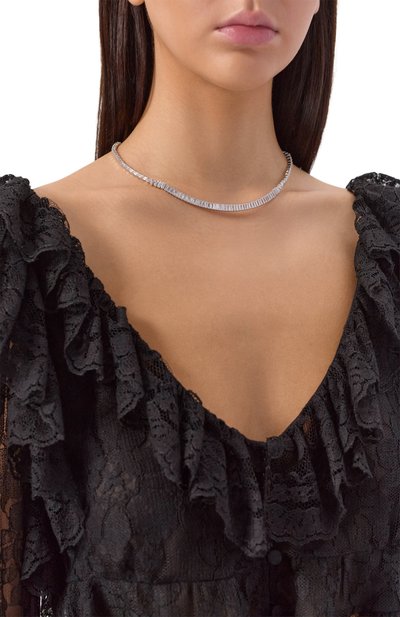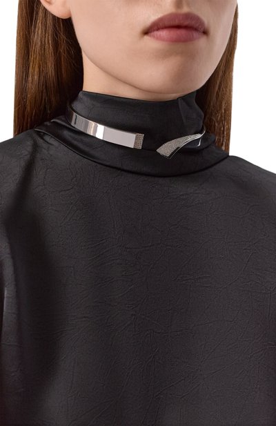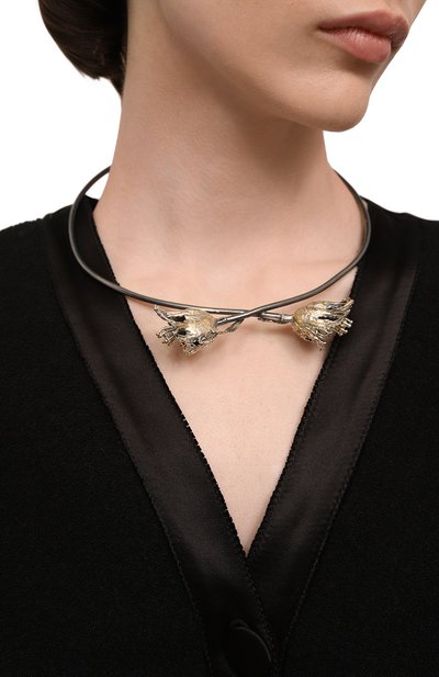 Жесткое двойное колье Hyperbola с замком-защелкой выполнили из полированного сплава с серебристым родиевым и золотистым покрытием. Одну часть аксессуара декорировали дорожкой из прозрачных кристаллов.