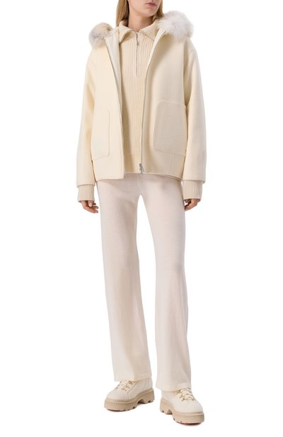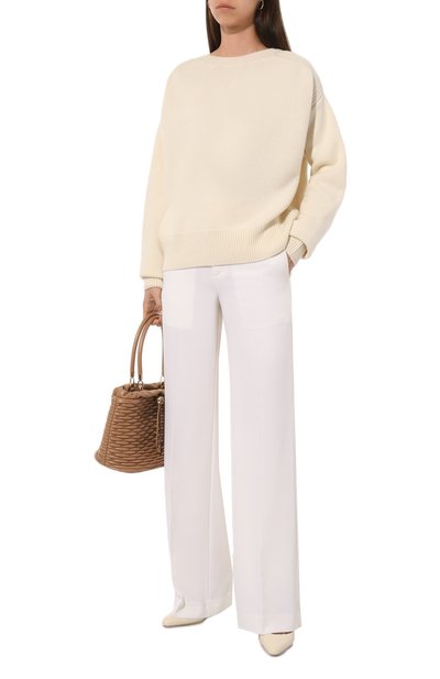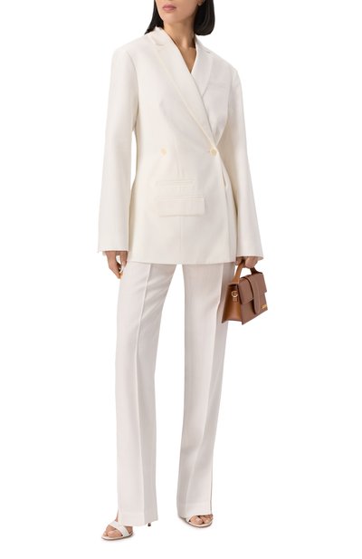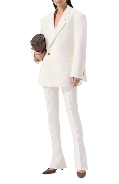 Облегающие брюки выполнили из вискозной ткани с добавлением эластана, сформировав визуально моделирующие фигуру швы. Разрезы снизу брючин украсили кольцами, напоминающими пирсинг. Похожей деталью заменили пуговицу, которой застегивается пояс.