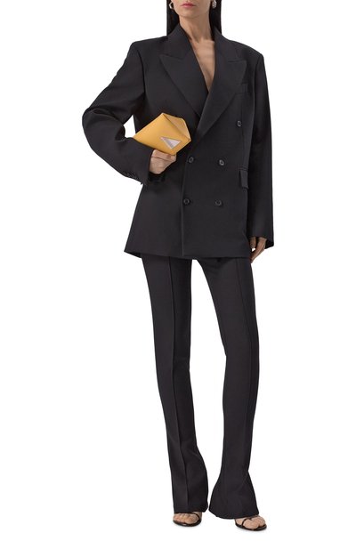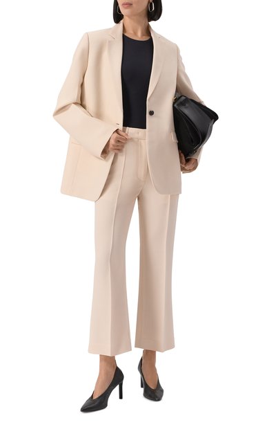 Облегающие брюки выполнили из вискозной ткани с добавлением эластана, сформировав визуально моделирующие фигуру швы. Разрезы снизу брючин украсили кольцами, напоминающими пирсинг. Похожей деталью заменили пуговицу, которой застегивается пояс.