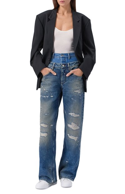 Пятикарманные джинсы boyfriend, усыпанные кристаллами, с шили из хлопкового денима с искусственными потертостями и заломами. Пояс сзади дополнили брендированным патчем, а спереди — перемычками с пряжками Medusa '95, с которыми рифмуется пуговица на ширинке.
