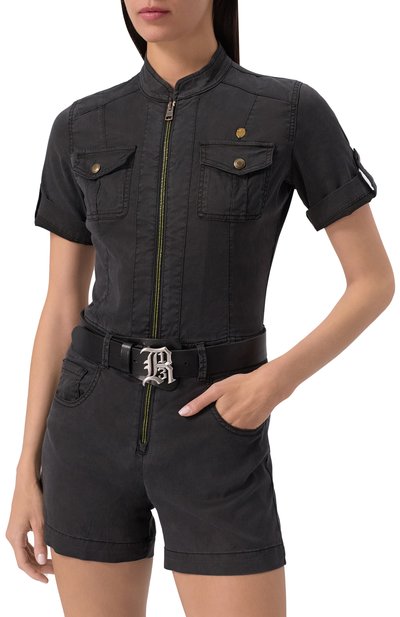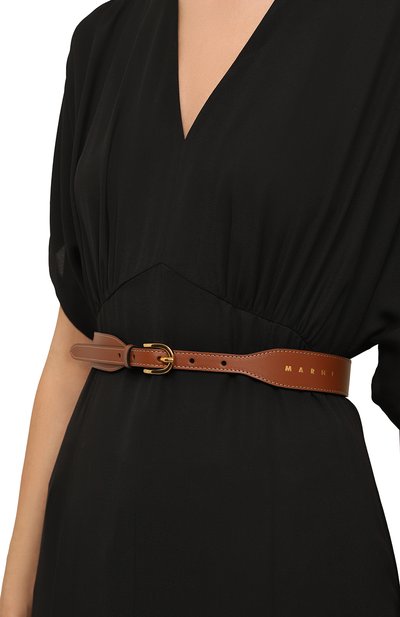 Ремень с тренчиком в тон выполнили из плотной кожи. Аксессуару с серебристой патинированной пряжкой в виде эмблемы придали состаренный вид при помощи потертостей и необработанных краев.