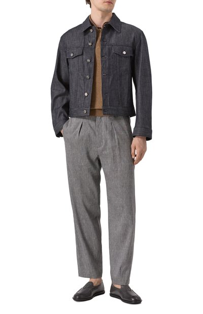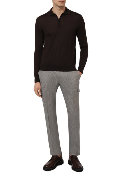 Шерстяные брюки с эластичной вставкой на поясе дополнили парными боковыми и задними карманами, а также врезными карго с клапанами. Модель с отглаженными стрелками украсили металлической подвеской-октагоном спереди.