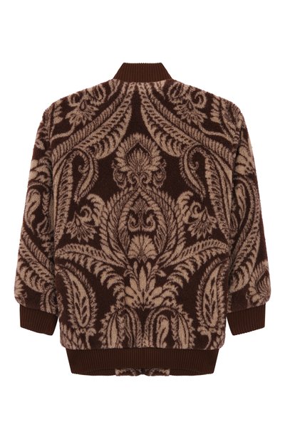 Бомбер с трикотажными полосатыми манжетами, низом и воротником выполнили из стрейчевого полиэстера с принтом MA Quad. На груди вышили логотип. Куртка с двумя боковыми карманами застегивается брендированными кнопками.