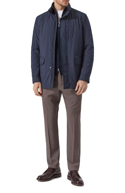 Куртку с воротником-стойкой сшили из влагостойкого полиэстера. Модель с внутренней кулиской на талии и манжетами на кнопках дополнили накладными боковыми карманами с клапанами.