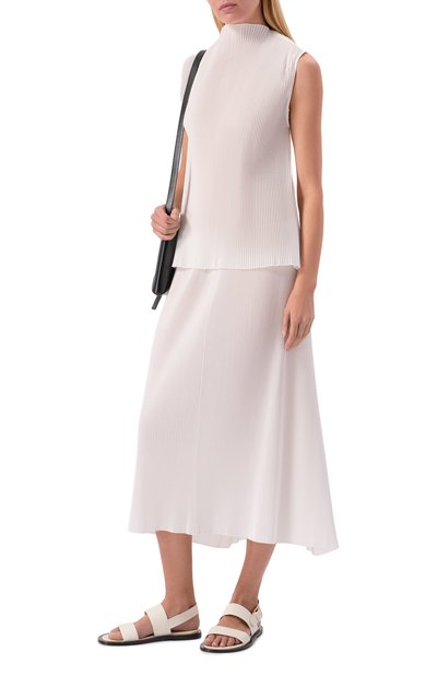 Облегающий топ выполнили из хлопковой пряжи, укрепленной шелком. Связанную узором пуантель модель дополнили поясом, проймами и горловиной в рубчик. Сзади изделие украсили брендированной накладкой.